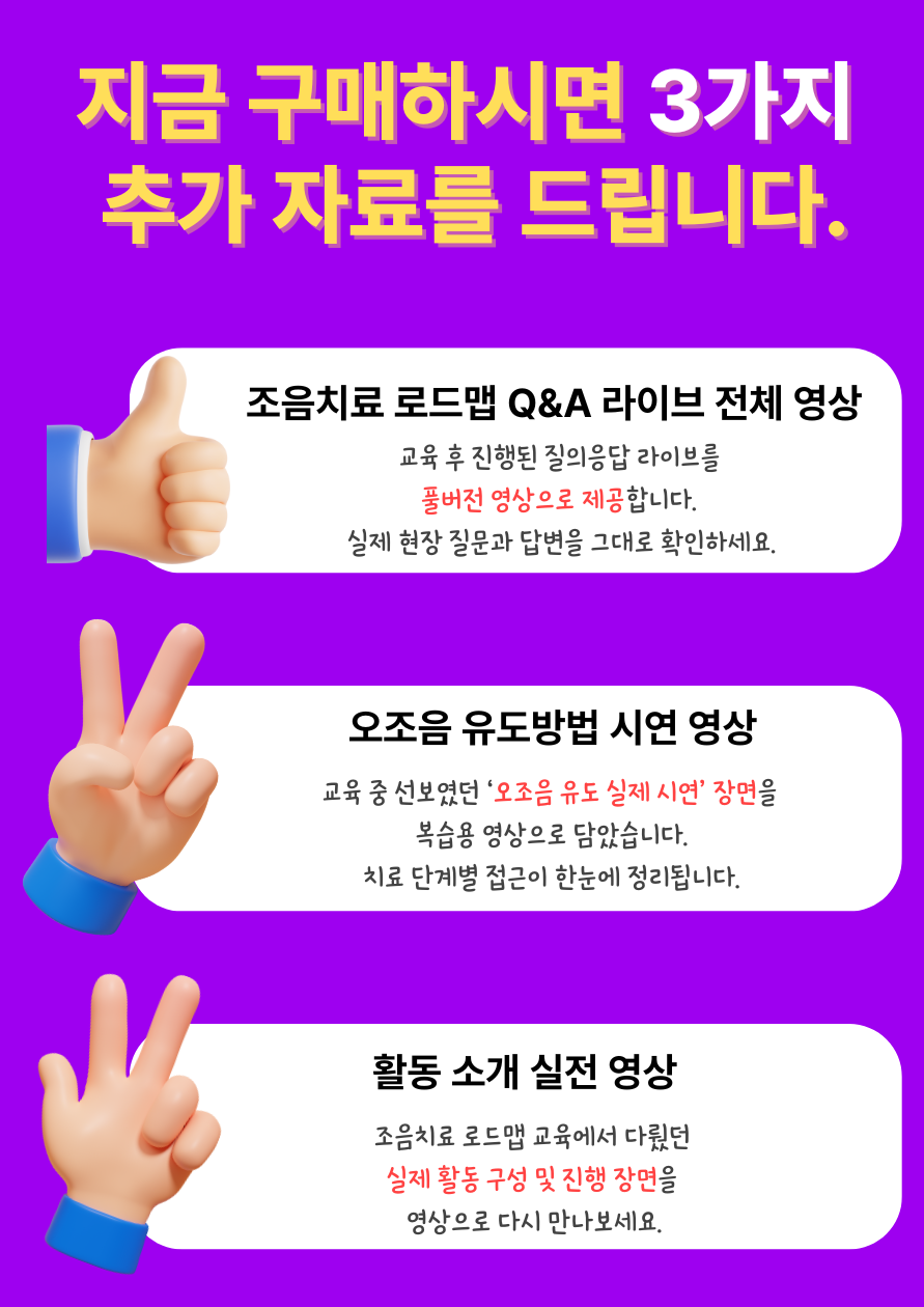 개인적으로 제일 자신없고 어려웠던게 조음이었습니다. 그러나 실습하고 공부를 하면서 궁금하고 더 잘가르치고 싶어서 강의를 검색하다가 우연찮게 발견하고 집중해서 강의를 잘들었던것같습니다. ㅅ를 ㄷ로 대치하고 유탭과 조음검사에서도 문제가 많아 궁금한거 투성이었는데, 궁금했던것들이 질의응답에서 나오고 많은 지도해주셔서 궁금증도 많은 조언도 얻은것같아 강의 추천드리고 유료강의도 궁금합니다!